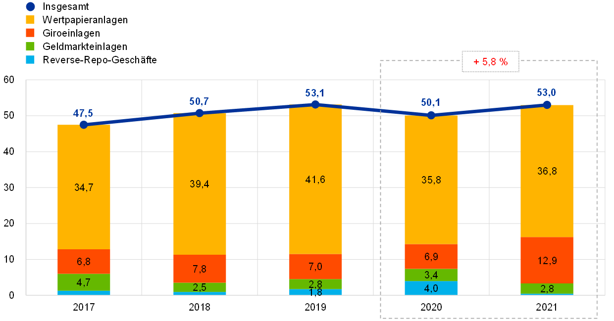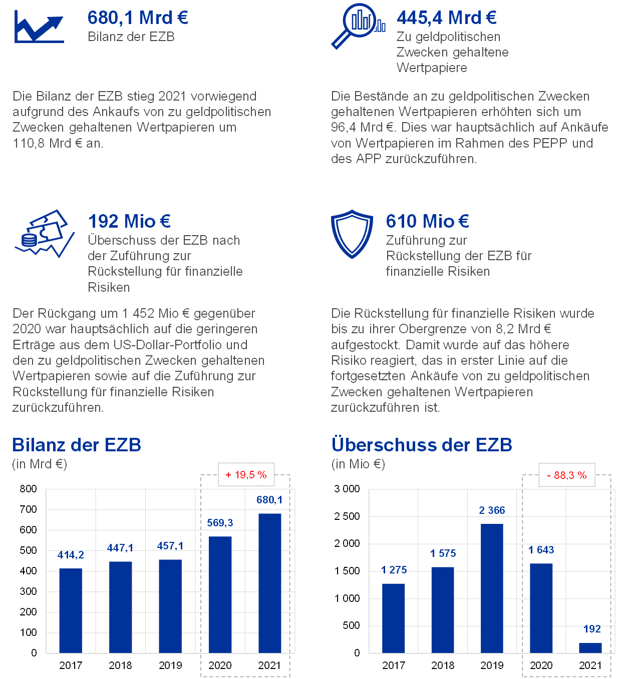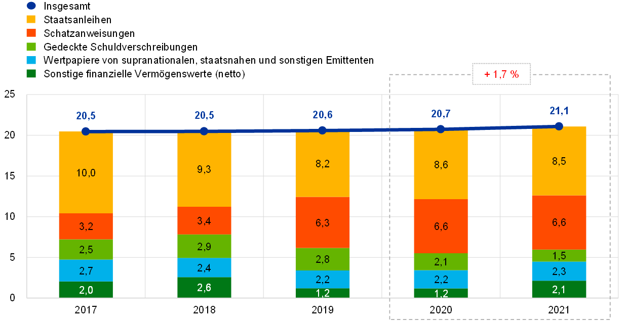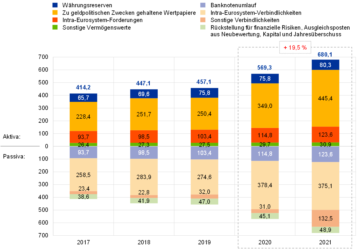 Im Jahr 2021 weitete sich die Bilanz der EZB um 110,8 Mrd € auf 680,1 Mrd € aus. Dies war vor allem auf den Anteil der EZB an Wertpapierankäufen im Rahmen des PEPP und des APP zurückzuführen. Diese Ankäufe hatten einen Anstieg des Bestands der zu geldpolitischen Zwecken gehaltenen Wertpapiere zur Folge. Gleichzeitig führte der Barausgleich dieser Ankäufe über TARGET2-Konten zu einem entsprechenden Anstieg der Intra-Eurosystem-Verbindlichkeiten. Dieser Anstieg der Intra-Eurosystem-Verbindlichkeiten wurde durch die von TARGET2-Kunden der EZB außerhalb des Euro-Währungsgebiets erhaltenen Barmittel mehr als ausgeglichen, die auch zu einem Zuwachs sonstiger Verbindlichkeiten führten.