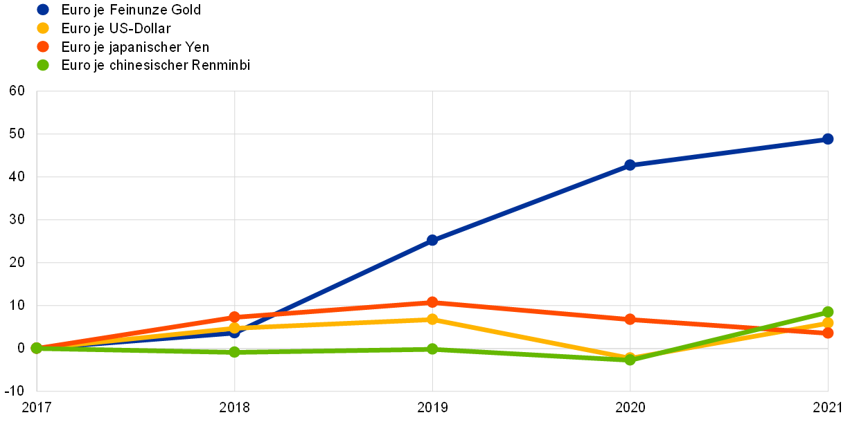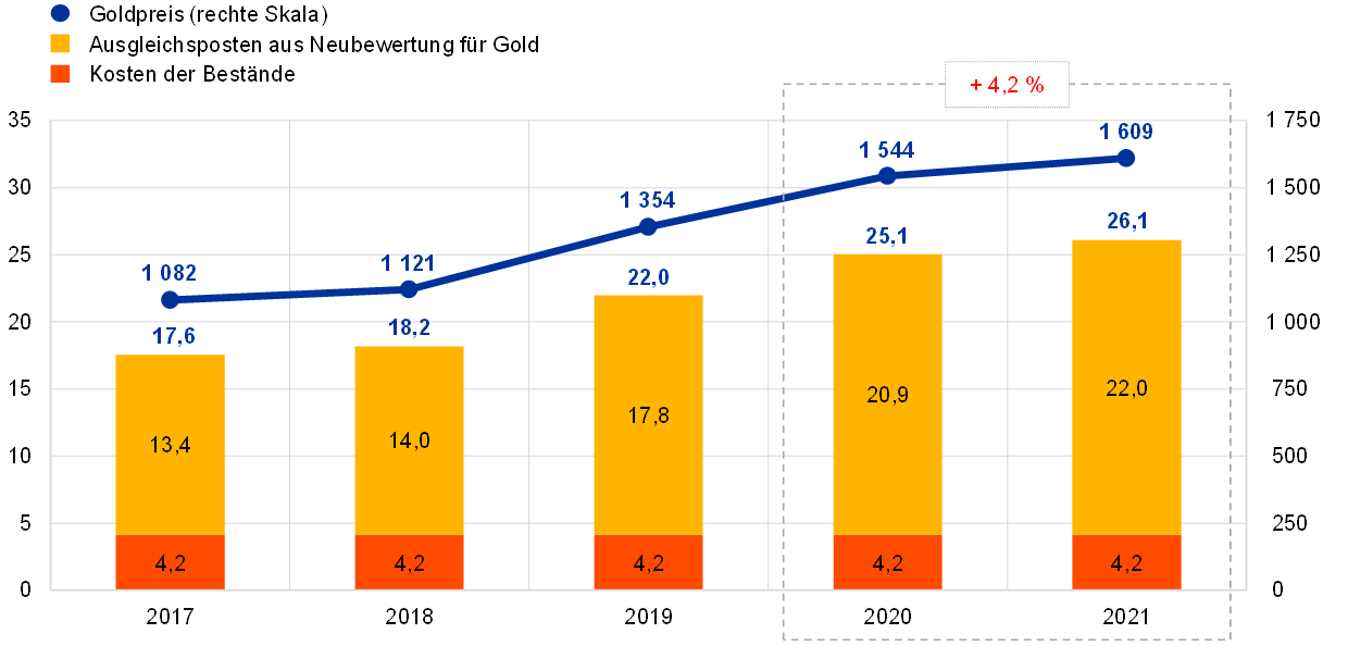 Der Euro-Gegenwert der Bestände der EZB an Gold und Goldforderungen nahm 2021 um 1,1 Mrd € zu und lag bei 26,1 Mrd € (siehe Abbildung 4), was einem Anstieg des Goldpreises in Euro zuzuschreiben war. Derweil blieb der Goldbestand in Feinunzen unverändert. Diese Zunahme führte auch zu einem entsprechenden Anstieg des Ausgleichspostens aus Neubewertung für Gold der EZB (siehe Abschnitt 1.3.2 „Finanzielle Mittel“).