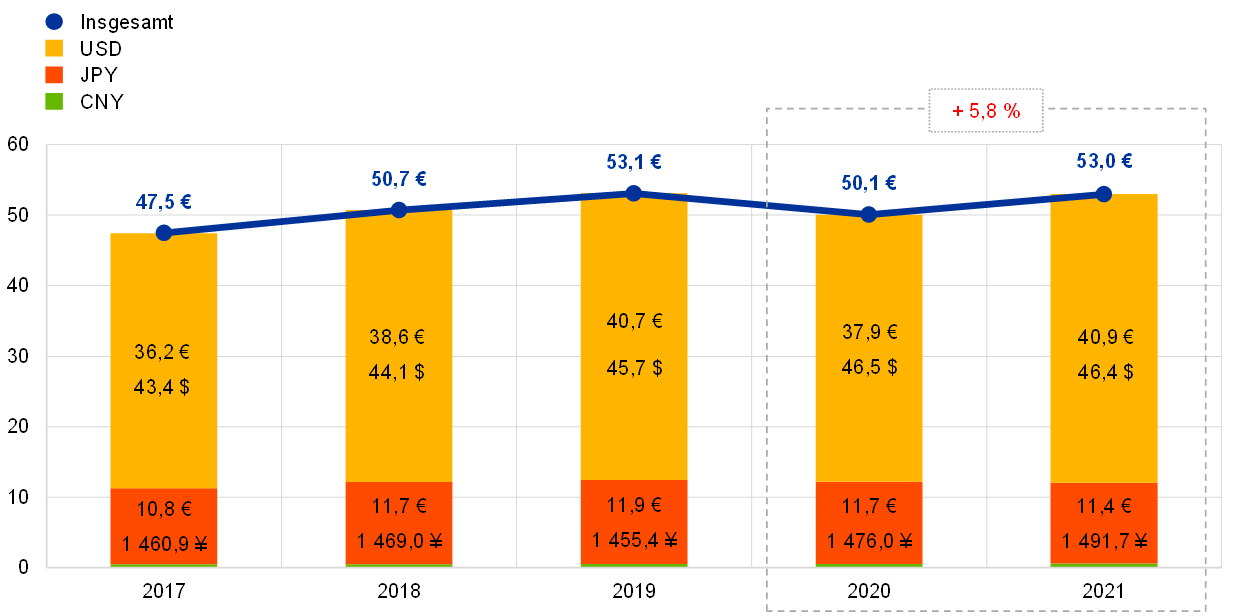 Zum Jahresende 2021 machen US-Dollar mit rund 77 % des Gesamtbestands weiterhin den größten Anteil der Devisenbestände der EZB aus.
