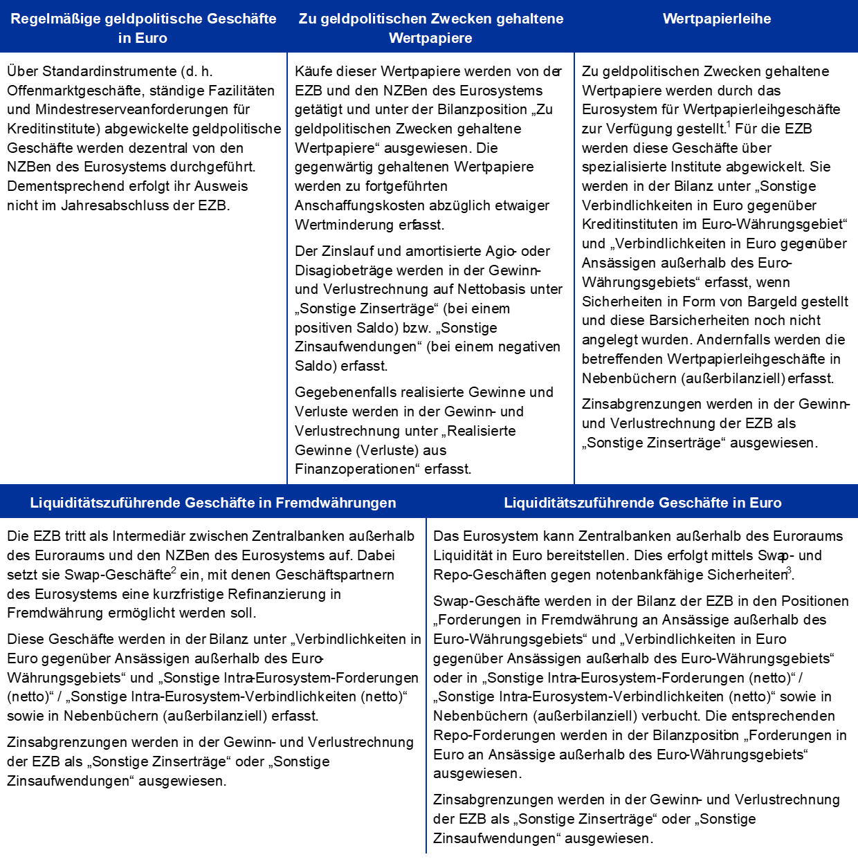 Das Prinzip der dezentralen Durchführung der Geldpolitik im Eurosystem spiegelt sich darin wider, dass die geldpolitischen Geschäfte des Eurosystems im Jahresabschluss der EZB und in den jeweiligen Jahresabschlüssen der NZBen des Euroraums erfasst werden. Tabelle 1 gibt einen Überblick über die wichtigsten von der EZB in Erfüllung ihres Mandats ausgeführten Geschäfte und wahrgenommenen Funktionen und erläutert die jeweiligen Auswirkungen auf den EZB-Jahresabschluss.