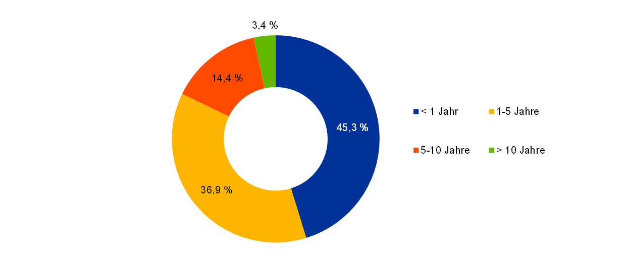 Das Eigenmittelportfolio der EZB besteht vorwiegend aus Anlagen der finanziellen Mittel der EZB. Hierzu zählen ihr eingezahltes Kapital, der allgemeine Reservefonds und die Rückstellung für finanzielle Risiken. Aufgrund der Wiederanlage von Erlösen und der Bewertung von Wertpapieren zu Marktpreisen haben das Eigenmittelportfolio und die genannten finanziellen Mittel nicht unbedingt denselben Umfang. Durch die Portfolioerträge werden die nicht mit Aufsichtsaufgaben zusammenhängenden Betriebsaufwendungen der EZB mitfinanziert.[11] Es wird in auf Euro lautende Vermögenswerte angelegt. Hierbei gelten die durch die Regelungen zur Risikokontrolle vorgegebenen Grenzen. Daraus ergibt sich eine stärker diversifizierte Laufzeitstruktur (siehe Abbildung 9) als bei den Währungsreserven.