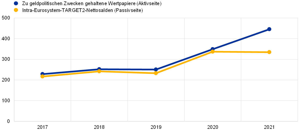 Die Auswirkungen der Ankäufe von zu geldpolitischen Zwecken gehaltenen Wertpapieren auf die TARGET2-Nettoverbindlichkeiten wurden 2021 mehr als ausgeglichen. Dies ist vorwiegend auf die von der EZB in ihrer Rolle als Fiskalagent akzeptierten höheren Einlagen von TARGET2-Kunden der EZB außerhalb des Euro-Währungsgebiets und von Ansässigen außerhalb des Euro-Währungsgebiets sowie den Anstieg von in Form von Barmitteln erhaltenen Sicherheiten aus Wertpapierleihgeschäften zurückzuführen.