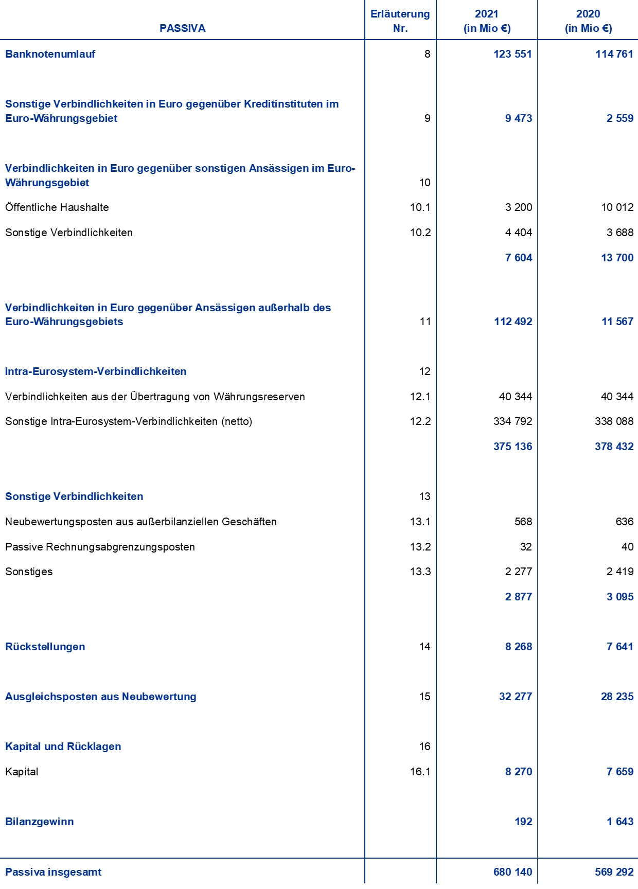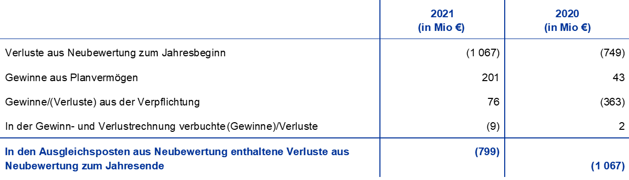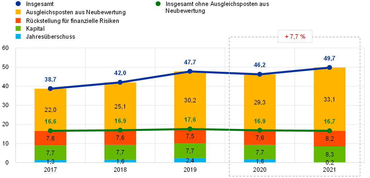Anmerkung: Die Position „Ausgleichsposten aus Neubewertung“ umfasst den gesamten Gewinn aus der Neubewertung der Gold-, Fremdwährungs- und Wertpapierbestände, berücksichtigt jedoch nicht den Ausgleichsposten aus Neubewertung von Leistungen nach Beendigung des Arbeitsverhältnisses.