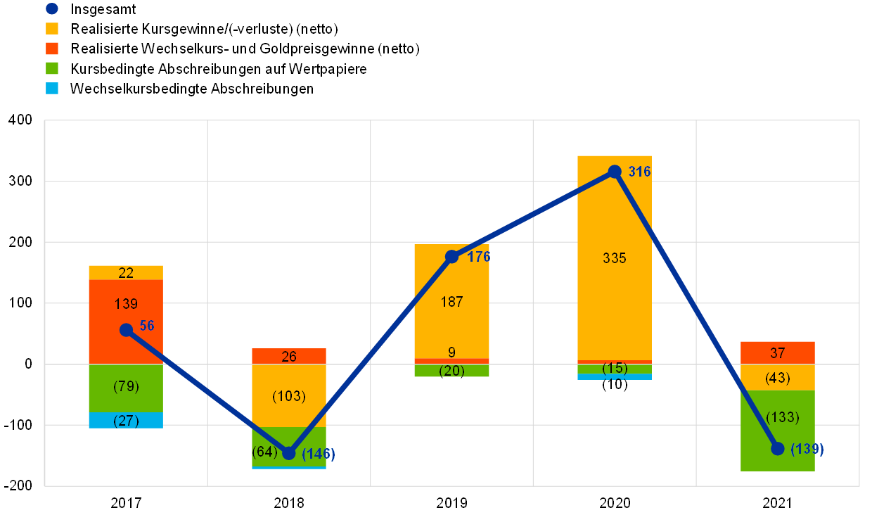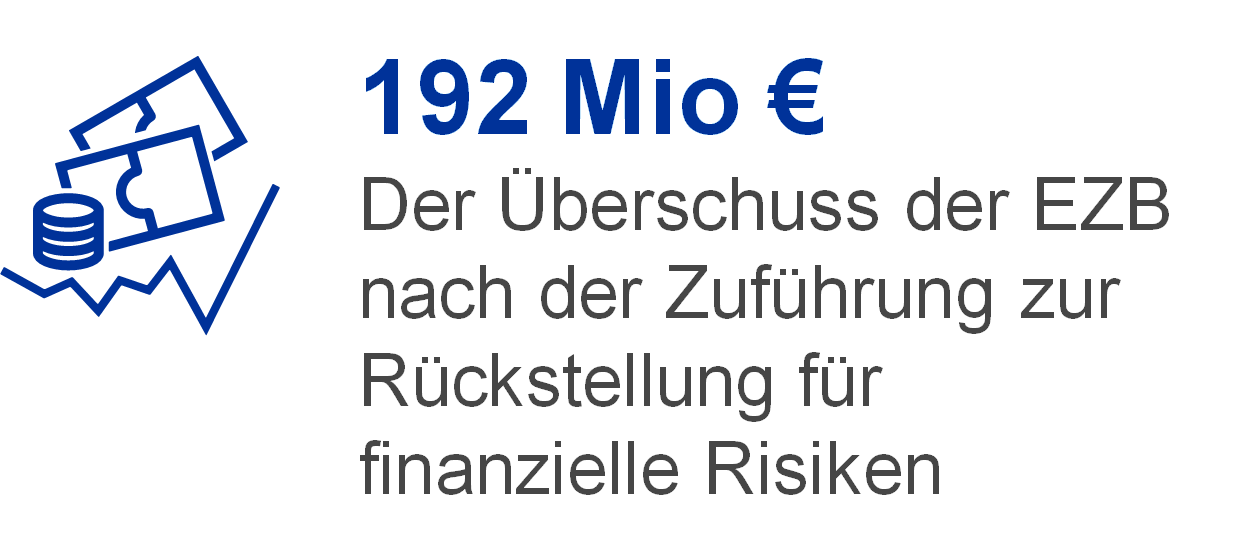 Der Überschuss aus Forderungen und Verbindlichkeiten der EZB in einem Geschäftsjahr kann zum Auffangen potenzieller Verluste desselben Jahres verwendet werden. Im Jahr 2021 belief sich der Jahresüberschuss der EZB nach der Zuführung zur Rückstellung für finanzielle Risiken auf 0,2 Mrd € (siehe Abschnitt 1.3.3 „Gewinn- und Verlustrechnung“).