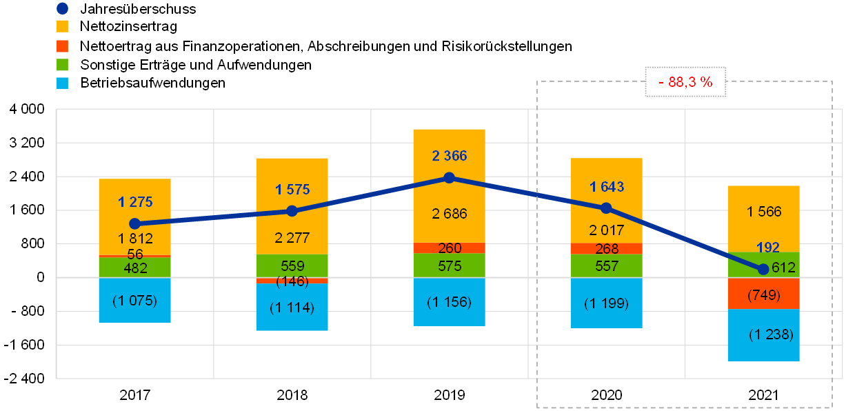 Im Jahr 2021 belief sich der Jahresüberschuss der EZB auf 192 Mio € (2020: 1 643 Mio €). Für den Rückgang um 1 452 Mio € gegenüber 2020 waren in erster Linie ein niedrigerer Nettoertrag aus Finanzoperationen, Abschreibungen und Risikorückstellungen verantwortlich, was insbesondere auf die Zuführung zur Rückstellung für finanzielle Risiken und geringere Nettozinserträge zurückzuführen ist (siehe Abbildung 13).