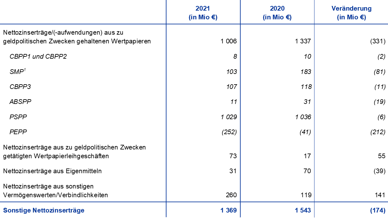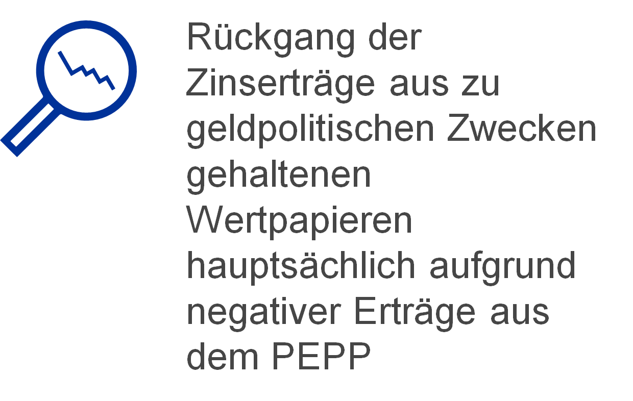 Die Nettozinserträge aus zu geldpolitischen Zwecken gehaltenen Wertpapieren sanken 2021 um 331 Mio € auf 1 006 Mio € (siehe Abbildung 15). Dies war hauptsächlich auf negative Nettozinserträge aus dem PEPP-Portfolio zurückzuführen. Die Fortsetzung der Ankäufe von Wertpapieren des öffentlichen Sektors im Rahmen des PEPP erfolgte zu einer negativen durchschnittlichen Rendite infolge der niedrigen Renditen von Staatsanleihen des Euro-Währungsgebiets während der Durchführung dieses Programms (siehe Abbildung 16) und führte 2021 zu einem Anstieg der negativen Nettozinserträge aus diesem Portfolio auf 252 Mio € gegenüber negativen Nettozinserträgen in Höhe von 41 Mio € im Vorjahr. Zudem gingen die Nettozinserträge aus den im Rahmen des SMP, CBPP1 und CBPP2 erworbenen Wertpapieren um 82 Mio € auf 111 Mio € zurück. Dieser Rückgang war zurückzuführen auf das geringere Volumen dieser Portfolios infolge fällig werdender Wertpapiere. Schließlich sanken die Nettozinserträge aus dem APP (aus im Rahmen des ABSPP, CBPP3 und PSPP gehaltenen Wertpapieren) um 37 Mio € auf 1 147 Mio €. Grund hierfür war hauptsächlich ein niedrigerer durchschnittlicher Zinsertrag aus im Rahmen des ABSPP gehaltenen Wertpapieren.