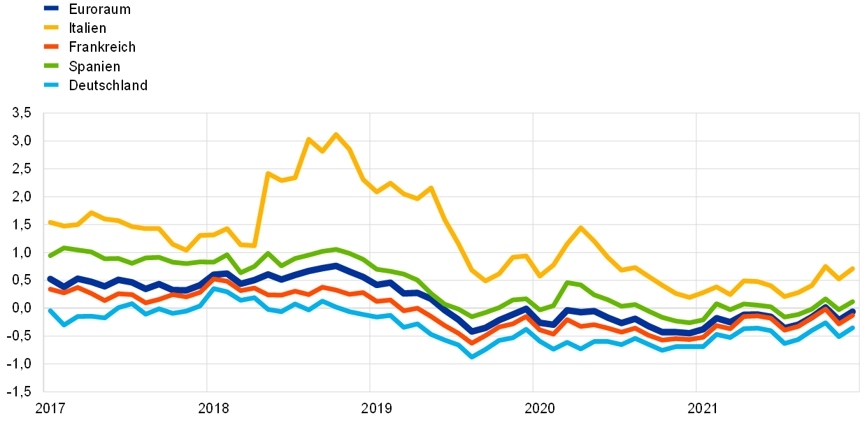 Im Dezember 2021 kündigte der EZB-Rat an[8], seine monatlichen Nettoankäufe im Rahmen des APP zu erhöhen, im zweiten Quartal 2022 auf einen Umfang von 40 Mrd € und im dritten Quartal 2022 auf einen Umfang von 30 Mrd €. Ab Oktober 2022 werden die Nettoankäufe von Vermögenswerten in einem monatlichen Umfang von 20 Mrd € so lange fortgesetzt, wie dies für die Verstärkung der akkommodierenden Wirkung der EZB-Leitzinsen erforderlich ist. Die Nettoankäufe werden beendet, kurz bevor der EZB-Rat mit der Erhöhung der EZB-Leitzinsen beginnt. Zudem beschloss der EZB-Rat, die Nettoankäufe im Rahmen des PEPP Ende März 2022 einzustellen. Sie könnten jedoch erforderlichenfalls wieder aufgenommen werden, um negativen Schocks im Zusammenhang mit der Pandemie entgegenzuwirken. Entsprechend dem Beschluss des EZB-Rats wird das Eurosystem die Tilgungsbeträge der im Rahmen des APP und des PEPP erworbenen Wertpapiere weiterhin vollumfänglich wieder anlegen.