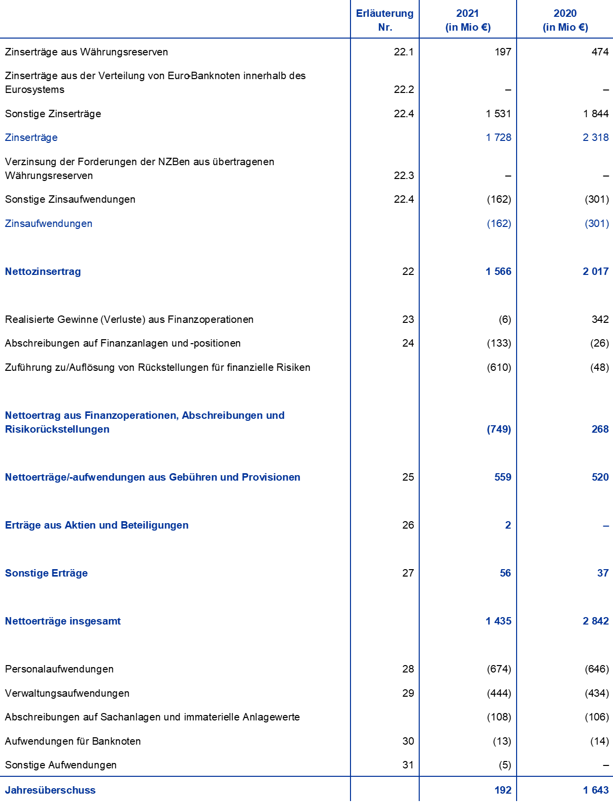 Die wichtigsten Positionen der Gewinn- und Verlustrechnung der EZB