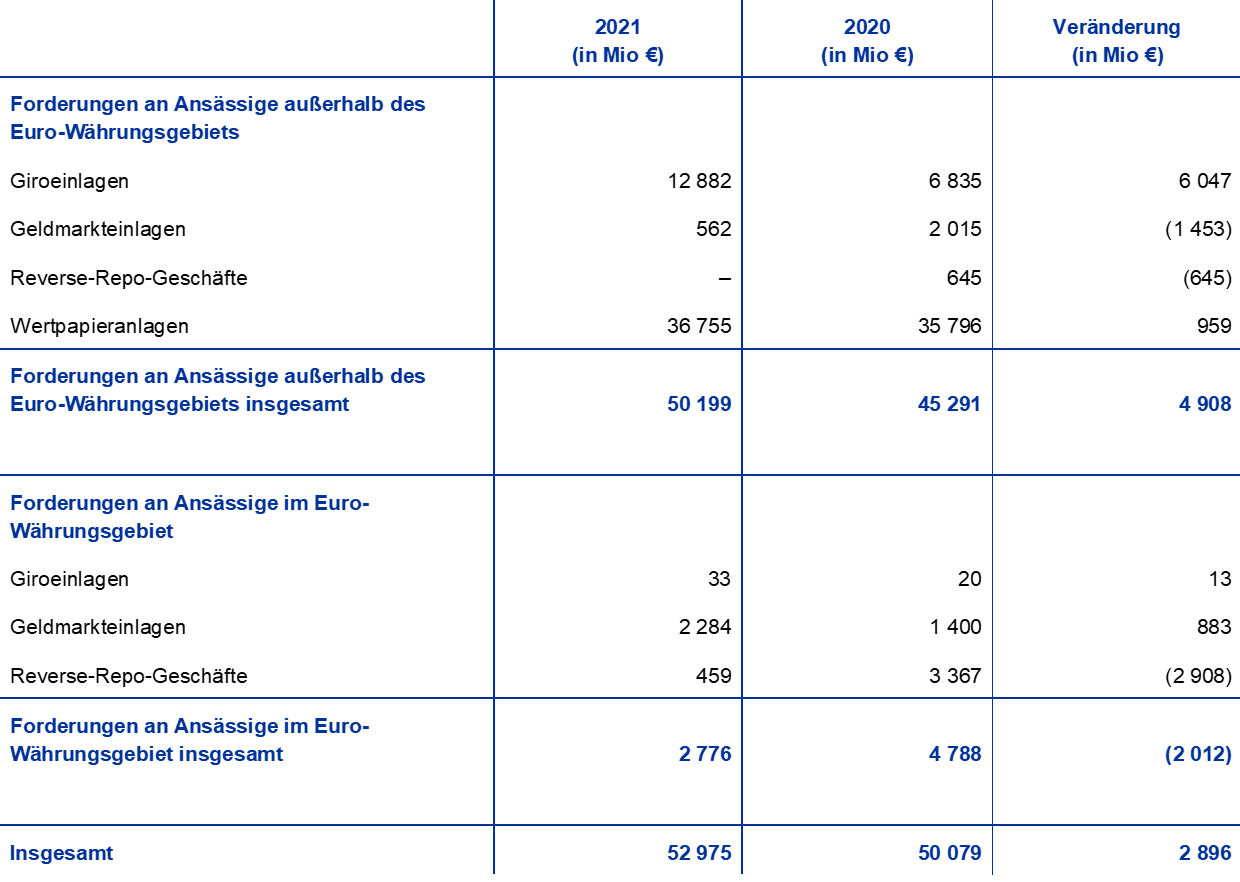 10. Diese Bestände umfassen Forderungen aus den Bilanzpositionen „Forderungen in Fremdwährung an Ansässige außerhalb des Euro-Währungsgebiets – Guthaben bei Banken, Wertpapieranlagen, Auslandskredite und sonstige Auslandsaktiva“ sowie „Forderungen in Fremdwährung an Ansässige im Euro-Währungsgebiet“.