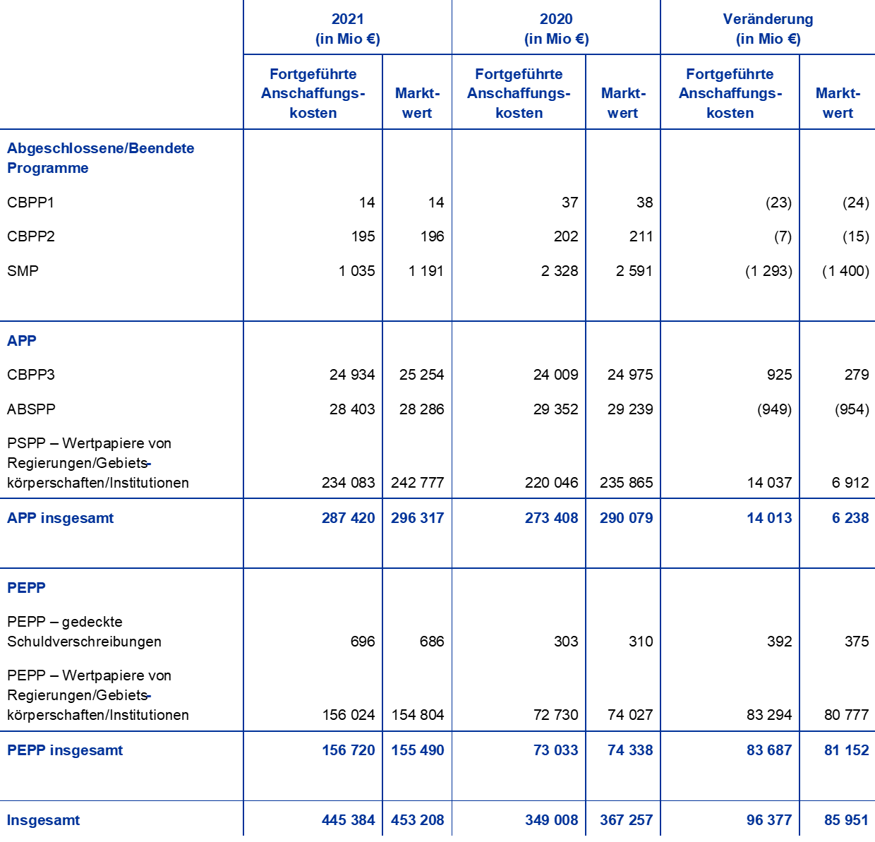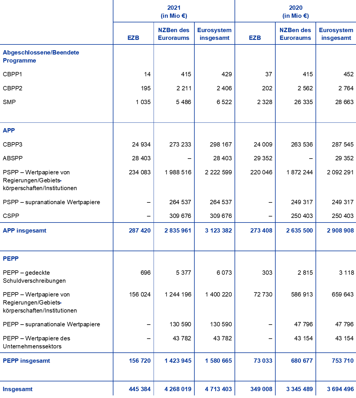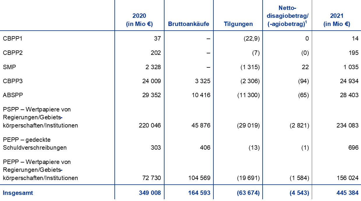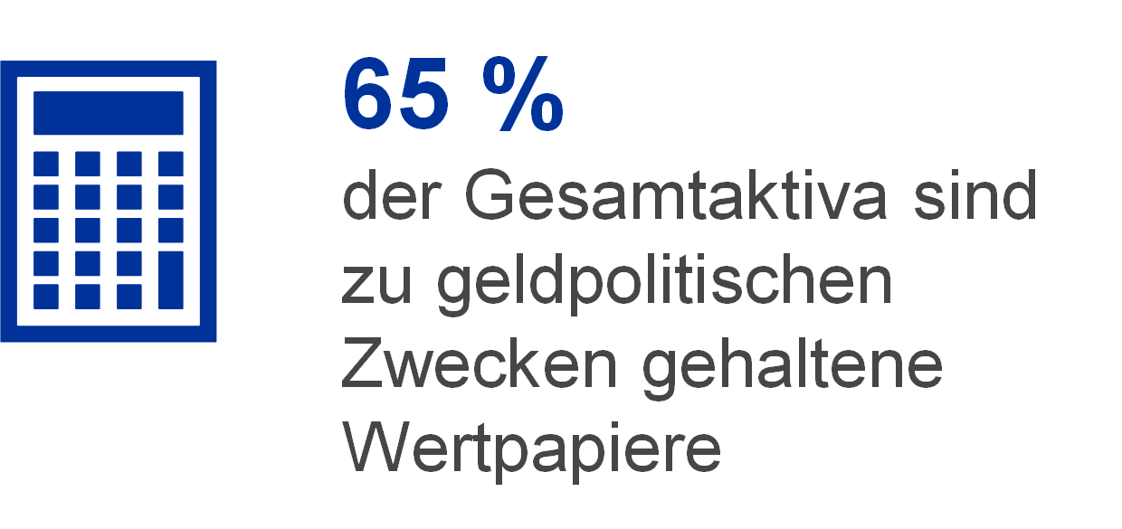 Zu geldpolitischen Zwecken gehaltene Euro-Wertpapiere machten Ende 2021 65 % der Gesamtaktiva der EZB aus. Unter dieser Bilanzposition weist die EZB Wertpapiere aus, die sie im Rahmen des Programms für die Wertpapiermärkte (Securities Markets Programme – SMP), der drei Programme zum Ankauf gedeckter Schuldverschreibungen (Covered Bond Purchase Programme – CBPP1, CBPP2 und CBPP3), des Ankaufprogramms für Asset-Backed Securities (Asset-Backed Securities Purchase Programme – ABSPP), des Programms zum Ankauf von Wertpapieren des öffentlichen Sektors (Public Sector Purchase Programme – PSPP) und des PEPP erworben hat.
