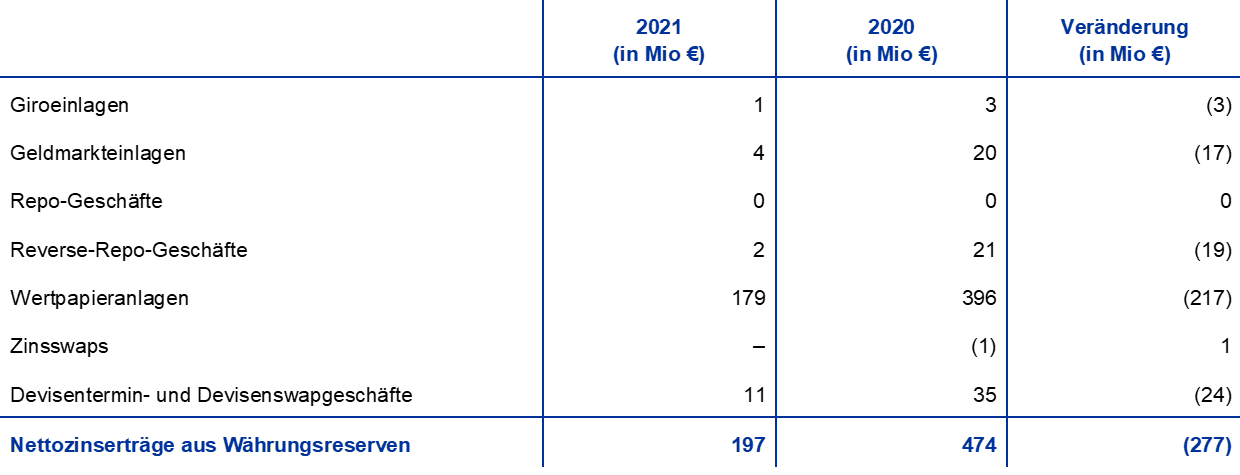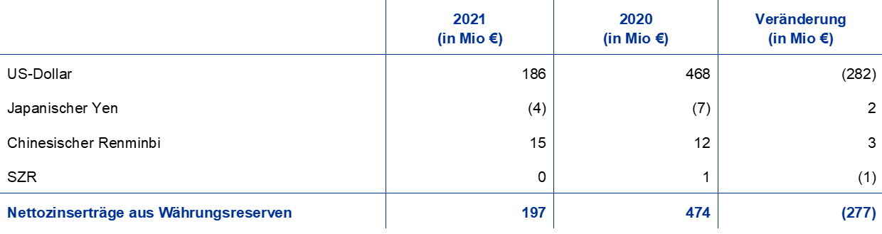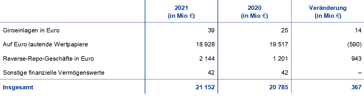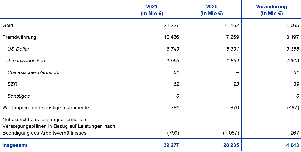 2021 stieg der Euro-Gegenwert der Währungsreserven der EZB um 4,5 Mrd € auf insgesamt 80,3 Mrd €. Sie bestehen aus Gold, Sonderziehungsrechten und Devisen (US-Dollar, japanische Yen und chinesische Renminbi).