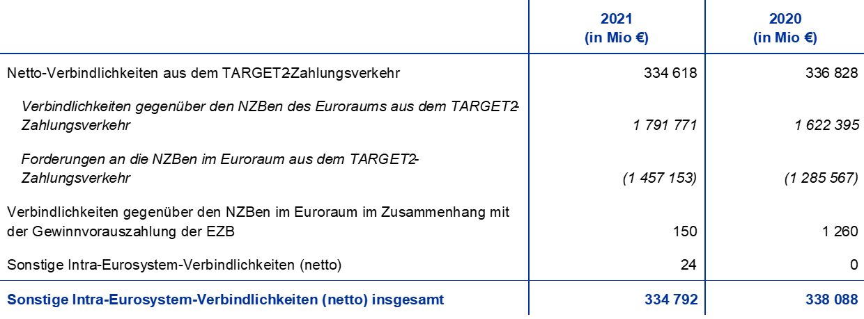 Die Intra-Eurosystem-Verbindlichkeiten der EZB gingen 2021 um 3,3 Mrd € auf 375,1 Mrd € zurück. Sie umfassen im Wesentlichen die TARGET2-Nettosalden der NZBen des Euroraums gegenüber der EZB und die Verbindlichkeiten der EZB hinsichtlich der Währungsreserven, die ihr von den NZBen des Euroraums im Zuge von deren Beitritt zum Eurosystem übertragen wurden. Hauptgrund für die Entwicklung der Intra-Eurosystem-Verbindlichkeiten im Zeitraum von 2017 bis 2020 war die Entwicklung der TARGET2-Nettoverbindlichkeiten infolge der EZB-Nettoankäufe von zu geldpolitischen Zwecken gehaltenen Wertpapieren, die über TARGET2-Konten abgewickelt werden (siehe Abbildung 10).