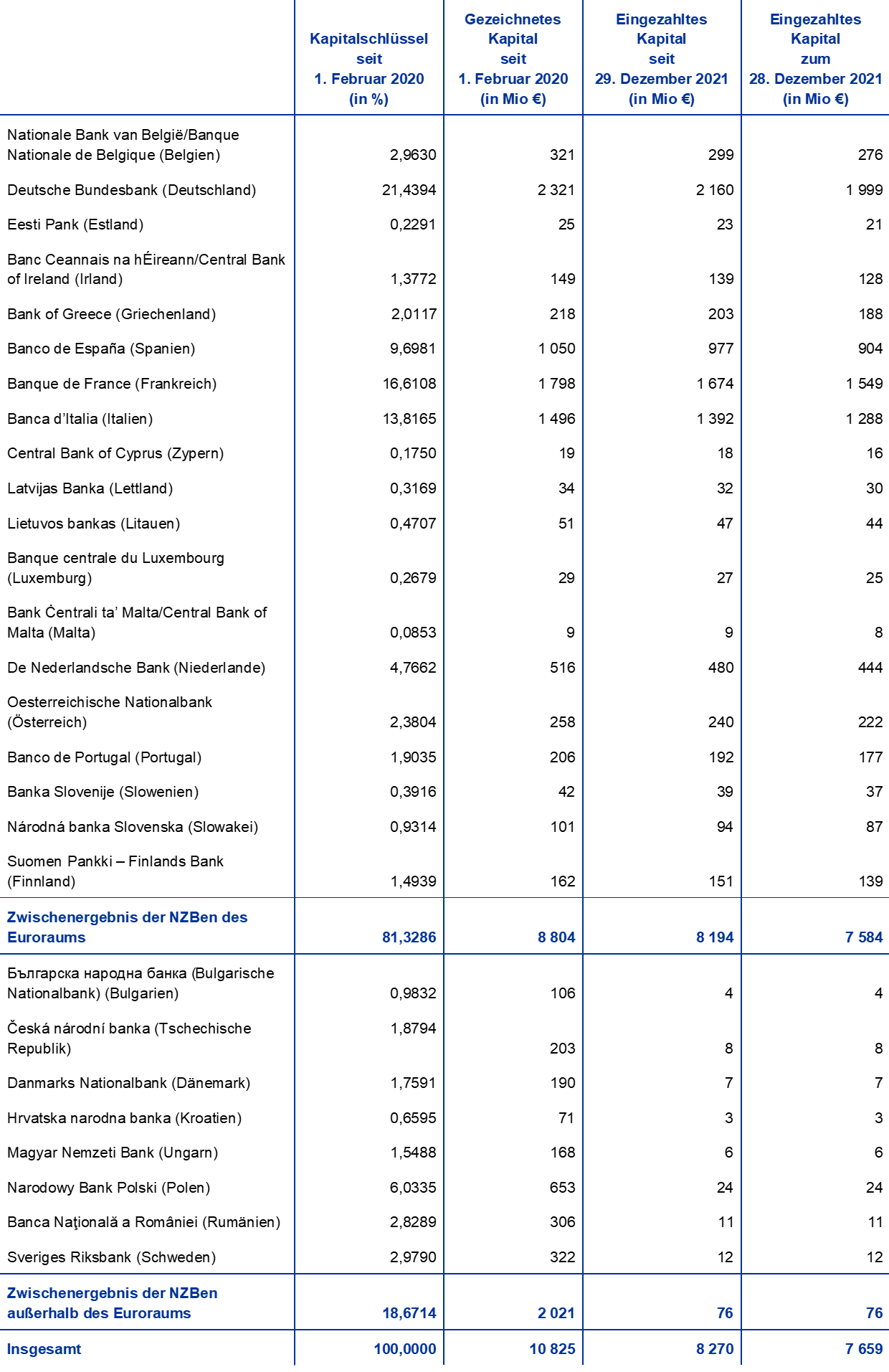 Nach dem Ausscheiden der Bank of England aus dem ESZB im Jahr 2020 erhöhten sich die Anteile der verbleibenden NZBen am gezeichneten Kapital der EZB. Der EZB-Rat hat beschlossen, dass die verbleibenden NZBen 2020 nur den entnommenen Kapitalanteil der Bank of England in Höhe von 58 Mio € ausgleichen und die NZBen des Euroraums ihre erhöhten Kapitalanteile in zwei gleich hohen jährlichen Raten 2021 und 2022 in voller Höhe einzahlen. Nachdem die NZBen des Euroraums die erste Rate eingezahlt hatten, erhöhte sich das eingezahlte Kapital der EZB 2021 um 0,6 Mrd € auf 8,3 Mrd €. Im Jahr 2022 wird es um weitere 0,6 Mrd € auf 8,9 Mrd € ansteigen.[14]