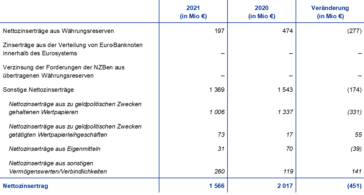 Die Nettozinserträge der EZB sanken um 451 Mio € auf 1 566 Mio € (siehe Abbildung 14). Dies war auf niedrigere Zinserträge aus zu geldpolitischen Zwecken gehaltenen Wertpapieren und aus Währungsreserven zurückzuführen. Diese Rückgänge wurden durch den Anstieg sonstiger Nettozinserträge nur teilweise ausgeglichen.