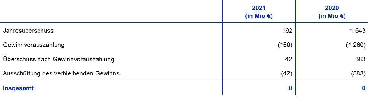 Der Jahresüberschuss der EZB belief sich im Jahr 2021 auf 192 Mio €. Nach einem entsprechenden Beschluss des EZB-Rats wurde am 31. Januar 2022 eine Gewinnvorauszahlung in Höhe von 150 Mio € an die NZBen des Euroraums geleistet. Des Weiteren beschloss der EZB-Rat, den verbleibenden Gewinn von 42 Mio € an die NZBen des Euroraums auszuschütten.