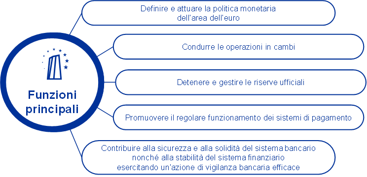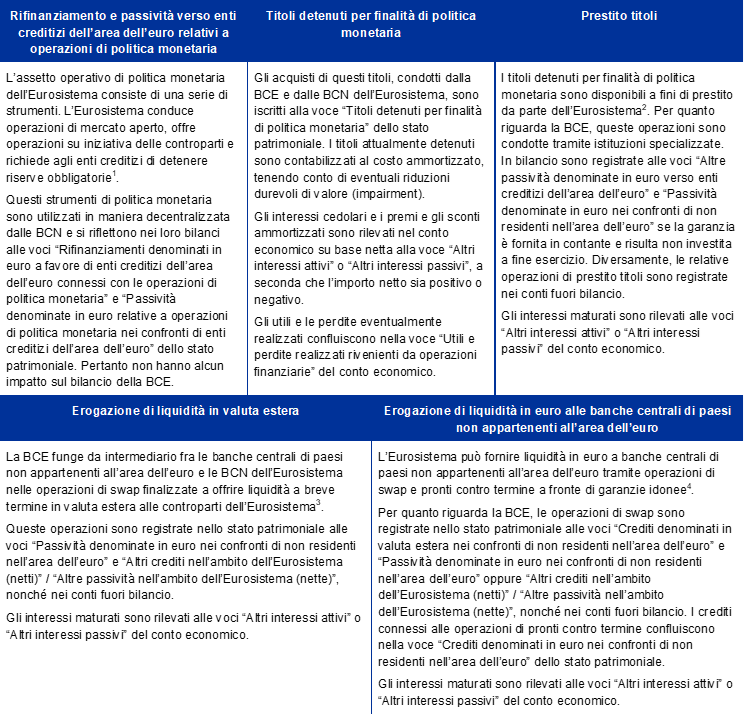 Le operazioni di politica monetaria dell’Eurosistema sono rilevate nei bilanci della BCE e delle BCN dei paesi dell’area dell’euro, in linea con il principio di attuazione decentrata della politica monetaria nell’ambito dell’Eurosistema. La tavola 1 offre una visione di insieme delle principali operazioni e funzioni svolte dalla BCE per assolvere il proprio mandato e del loro impatto sul bilancio della Banca.