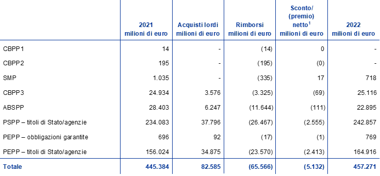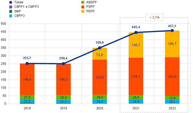 Sulla base delle relative decisioni del Consiglio direttivo, la BCE ha proseguito gli acquisti netti di attività del PEPP sino alla fine di marzo 2022, mentre quelli del PAA sono terminati il 1° luglio 2022. Al tempo stesso, la BCE ha continuato a reinvestire integralmente il capitale rimborsato sui titoli in scadenza dei due portafogli durante l’esercizio. A seguito di tali acquisti e reinvestimenti, il portafoglio dei titoli detenuti dalla BCE per finalità di politica monetaria è aumentato di 11,9 miliardi di euro collocandosi a 457,3 miliardi (grafico 2); le consistenze del PEPP e del PSPP hanno registrato rispettivamente un incremento di 9,0 miliardi di euro e di 8,8 miliardi. La diminuzione di 5,5 miliardi di euro delle consistenze dell’ABSPP è riconducibile ai rimborsi.
