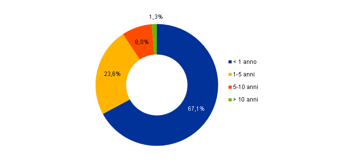 Il portafoglio detenuto a fronte dei fondi propri della BCE è costituito prevalentemente dagli investimenti delle sue risorse finanziarie, ossia il capitale versato e le consistenze del fondo di riserva generale e del fondo di accantonamento a fronte dei rischi finanziari. La finalità del portafoglio è fornire un reddito che contribuisca a finanziare le spese operative della BCE non connesse alle funzioni di vigilanza[12]. Il portafoglio è investito in attività denominate in euro, rispettando i limiti imposti dal sistema di controllo dei rischi. La struttura per scadenze risulta quindi più differenziata (grafico 9) rispetto a quella del portafoglio delle riserve valutarie.