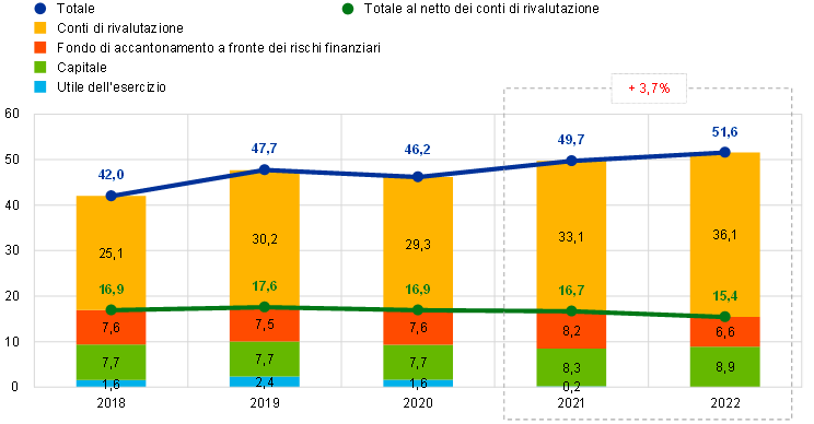 Nota: i “conti di rivalutazione” includono le plusvalenze totali risultanti dalla valutazione dell’oro, delle valute estere e dei titoli; non vi rientra invece il conto di rivalutazione relativo ai benefici successivi al rapporto di lavoro.