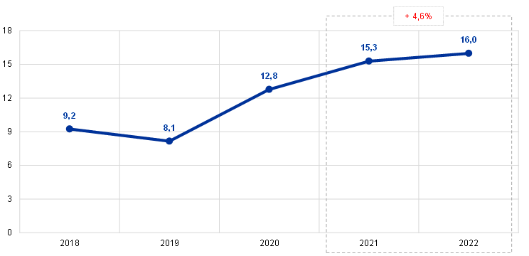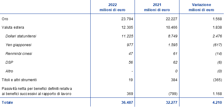 Nel 2022 il controvalore totale in euro delle riserve in valuta della BCE, costituite da oro, diritti speciali di prelievo, dollari statunitensi, yen giapponesi e renminbi cinesi, è aumentato di 4,1 miliardi di euro raggiungendo 84,5 miliardi.