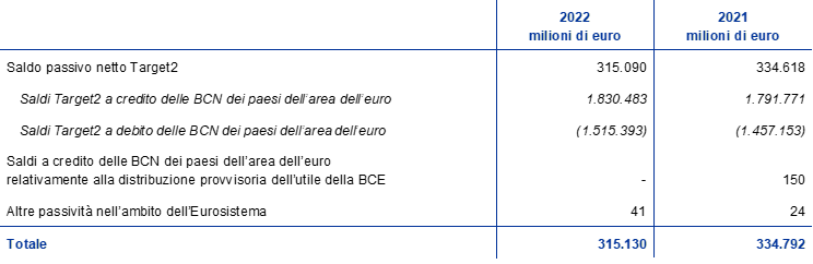 Nel 2022 le passività interne all’Eurosistema della BCE sono diminuite di 19,7 miliardi di euro portandosi a 355,5 miliardi. Queste comprendono soprattutto il saldo netto Target2 delle BCN dei paesi dell’area dell’euro nei confronti della BCE e le passività della BCE relative alle riserve ufficiali a essa trasferite dalle BCN al momento dell’adesione all’Eurosistema.