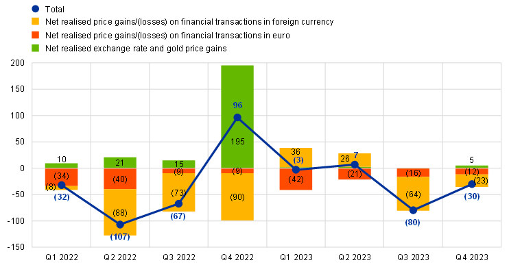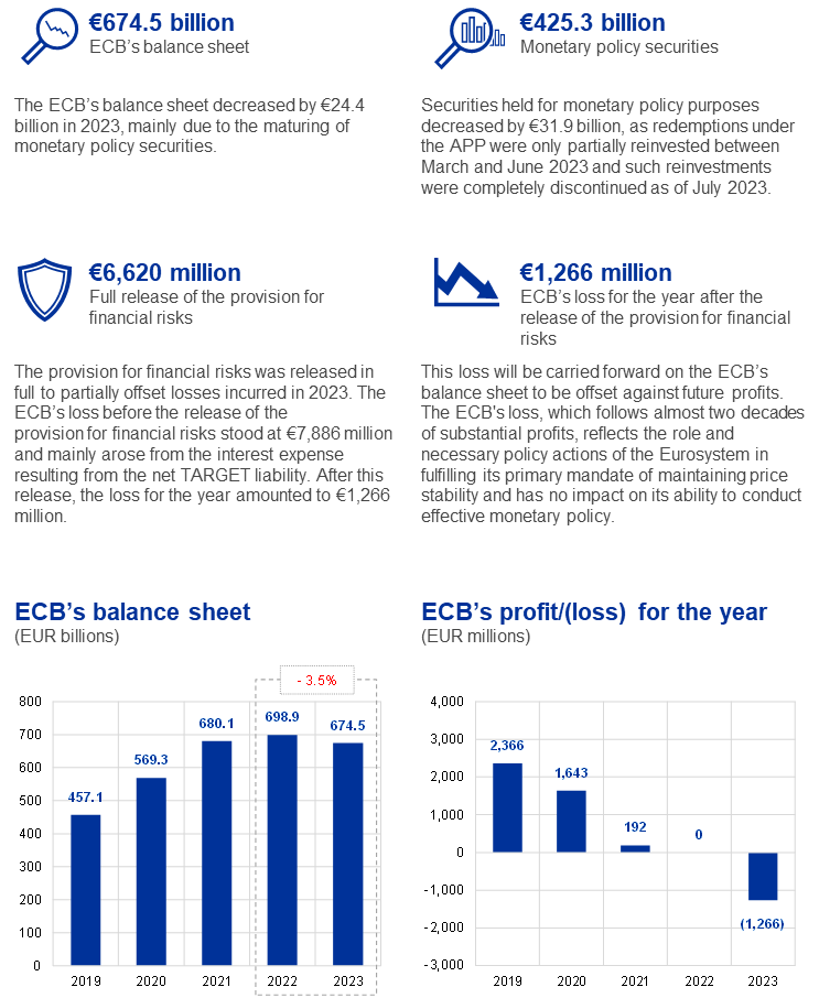 The ECB’s loss for 2023, after the full release of the provision for financial risks, was €1,266 million (2022: zero). Following a decision by the Governing Council, this loss will be carried forward on the ECB’s balance sheet and offset against future profits.