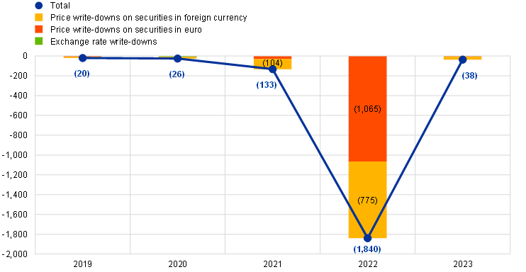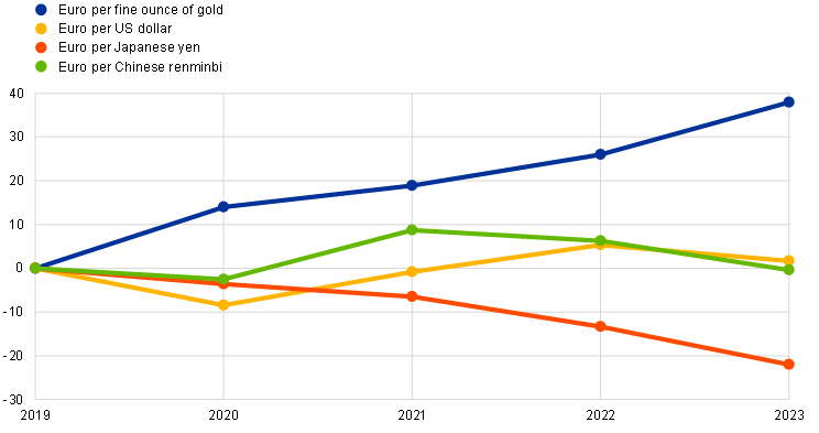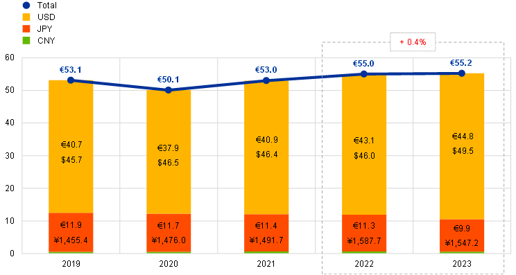 The ECB’s foreign currency holdings[11] of US dollars, Japanese yen and Chinese renminbi increased in euro terms by €0.2 billion to €55.2 billion (Chart 5), mainly owing to the income earned during the year, primarily on the US dollar portfolio. In addition, upon the adoption of the single currency by Croatia with effect from 1 January 2023, Hrvatska narodna banka transferred to the ECB foreign reserve assets denominated in US dollars with a value of €544 million. The increase in the total value of foreign currency holdings was partially offset, mainly by the depreciation of the US dollar and the Japanese yen against the euro.