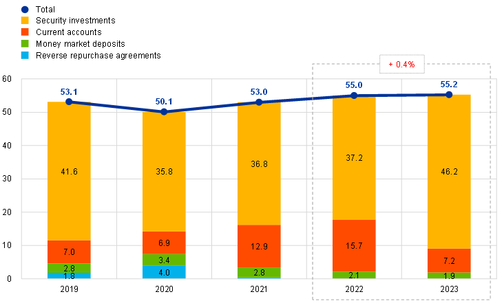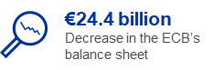 In 2023 the ECB’s balance sheet decreased by €24.4 billion to €674.5 billion, mainly owing to the gradual decline of APP holdings as a result of the only partial reinvestment of principal payments from maturing securities in this portfolio between March and June 2023 and the complete discontinuation of such reinvestments as of July 2023.