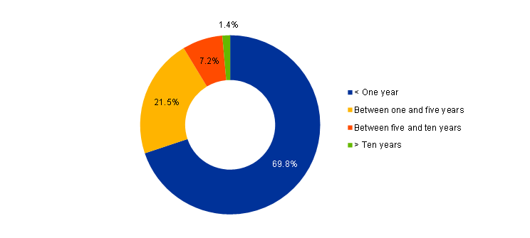 The ECB’s own funds portfolio predominantly consists of investments of its paid-up capital and amounts set aside in the general reserve fund and in the provision for financial risks. The purpose of this portfolio is to provide income to help fund those ECB operating expenses that are not related to the delivery of its supervisory tasks.[13] It is invested in euro-denominated assets, subject to the limits imposed by its risk control framework. This results in a more diversified maturity structure (Chart 9) than in the foreign reserves portfolio.