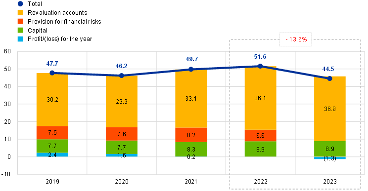 At the end of 2023 the ECB’s net equity totalled €44.5 billion (Chart 11), which was €7.0 billion lower than at the end of 2022 owing to the losses incurred during 2023. The provision for financial risks was fully used to cover part of these losses, reducing the loss for the year to €1.3 billion. The decrease in the ECB’s net equity arising from the 2023 losses was partially offset by (i) the increase in the revaluation accounts, mainly as a result of the rise in the market price of gold in euro terms in 2023, and (ii) the contributions from Hrvatska narodna banka to the paid-up capital, the revaluation accounts and the provision for financial risks following the adoption of the single currency by Croatia with effect from 1 January 2023.
