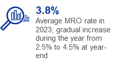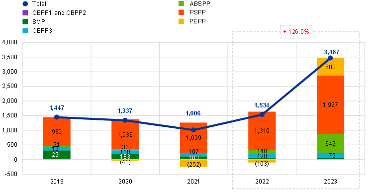 Based on the relevant Governing Council decisions, the Eurosystem continued reinvesting, in full, the principal payments from maturing securities under the PEPP throughout the year, and under the APP until the end of February 2023. From the beginning of March until the end of June 2023, the Eurosystem reinvested only partially the principal payments from maturing securities under the APP and as of July 2023 discontinued these reinvestments. As a result of these decisions, the portfolio of securities held by the ECB for monetary policy purposes decreased by €31.9 billion to €425.3 billion (Chart 2) with the PSPP, ABSPP and CBPP3 holdings under the APP decreasing by €18.0 billion, €9.5 billion and €1.6 billion respectively, driven by redemptions. The PEPP portfolio decreased by €2.6 billion, mainly owing to the net impact of the amortisation of premiums and discounts[8] on securities held in the portfolio.