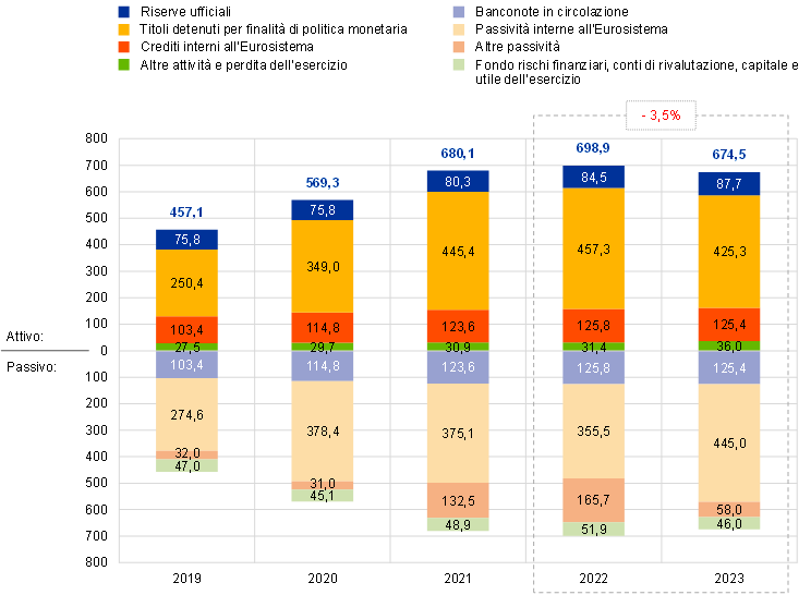 Nel 2023 lo stato patrimoniale della BCE ammonta a 674,5 miliardi di euro, evidenziando una diminuzione di 24,4 miliardi di euro principalmente dovuta alla graduale riduzione del portafoglio del PAA a seguito dei reinvestimenti solo parziali del capitale rimborsato sui titoli in scadenza tra marzo e giugno 2023 e della loro completa cessazione a luglio 2023.