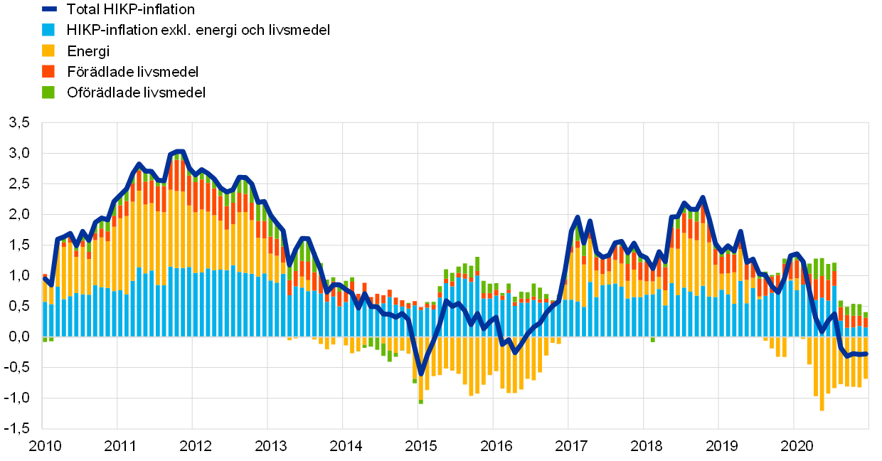 Den totala inflationen i euroområdet var i genomsnitt 0,3 procent under 2020, en minskning från 1,2 procent 2019. När det gäller komponenterna i det harmoniserade konsumentprisindexet (HIKP) avspeglade denna nedgång i huvudsak ett minskat bidrag från energiinflationen, men även från HIKP-inflation exklusive energi och livsmedel under andra halvåret (se diagram 9). När det gäller de underliggande faktorerna för denna utveckling skedde inflationsnedgången mot bakgrund av en snabb nedgång i den ekonomiska aktiviteten, främst ledd av en kraftig försvagning i konsumenternas efterfrågan. Detta innebar betydande nedåtrisker för de ekonomiska utsikterna. Det sjunkande inflationstrycket förklarades också av vissa faktorer som var specifika för de ekonomiska konsekvenserna av och reaktionerna på covid-19-pandemin. Den fortsatta minskningen i inflationen under andra halvåret berodde till exempel delvis på prisfallet för reserelaterade tjänster (framför allt transporter och hotell), som drabbats hårdast av krisen, och på effekterna av den tillfälliga momssänkningen i Tyskland.