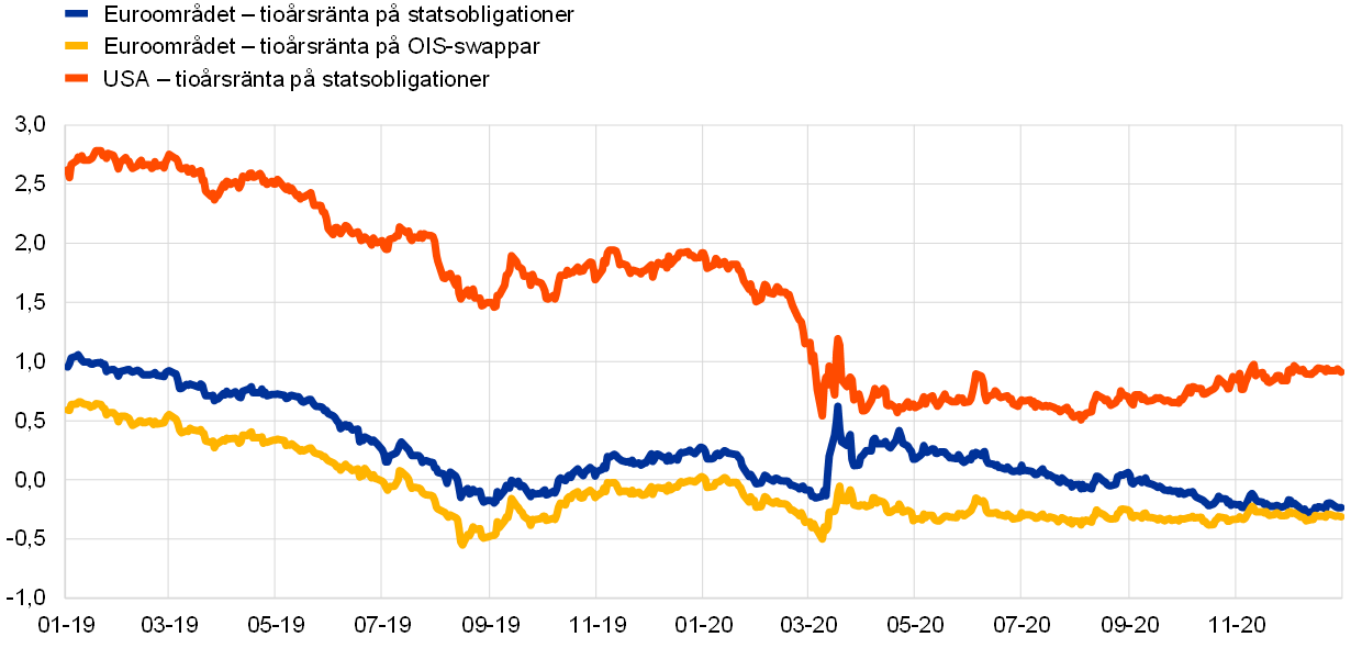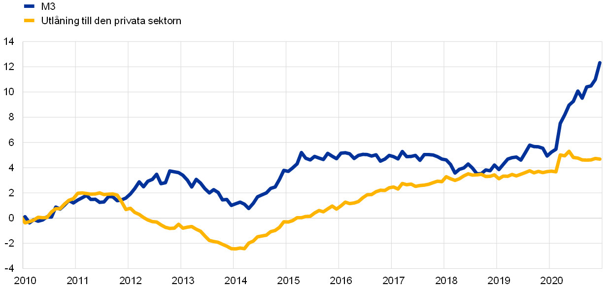 Pandemin slog också hårt mot euroområdets ekonomi. Pandemin påverkade till exempel konsumtionen, som minskade kraftigt under första halvåret till följd av omfattande nedstängningsåtgärder och ökad riskaversion. Aktiviteten, särskilt inom tjänstesektorn, sjönk också markant på grund av bristande efterfrågan och restriktioner för aktiviteter. Till följd av detta minskade real BNP exceptionellt snabbt under årets andra kvartal. Samtidigt agerade de penning- och finanspolitiska beslutsfattarna snabbt och beslutsamt för att bemöta nedgången i efterfrågan och den stora osäkerheten, bland annat genom att säkerställa gynnsamma och stabila finansieringsförhållanden och fortsatt tillgång till likviditet. Redan från början av covid-19-krisen bedömdes lågkonjunkturens djup och varaktighet i hög grad utifrån möjligheterna att hitta medicinska lösningar, särskilt i form av ett vaccin. Tillsammans med kraftfulla och samordnade politiska åtgärder ledde senhöstens positiva nyheter om vaccinutvecklingen till att förtroendet gradvis återupprättades. Tillväxtutvecklingen var fortsatt volatil under andra halvåret, då en förnyad smittspridningsvåg slog till, men samtidigt förstärktes och stabiliserades tillväxtförväntningarna. Prisutvecklingen påverkades också starkt av pandemin. Till följd av sviktande efterfrågan, lägre oljepriser och minskad aktivitet sjönk HIKP-inflationen under året och var mer eller mindre negativ från augusti och framåt. Andra faktorer, som den tillfälliga tyska momssänkningen under andra halvåret, pressade också ner inflationen. Samtidigt har förväntningarna på en stabil återhämtning under 2021 och ett omslag i temporära faktorer, som till exempel den tyska momssänkningen, förstärkt utsikterna till en ökad inflation. Kraftfulla politiska åtgärder ledde till att kredit- och finansieringsförhållandena kunde upprätthållas. Detta uppvägde till stor del bankernas åtstramade utlåningsvillkor till följd av den försämrade riskmiljön. Även om de marknadsstörningar som pandemichocken orsakade ledde till en kraftig åtstramning av de finansiella förhållandena i mars, bidrog snabba politiska åtgärder till att avkastningen på statsobligationer i euroområdet överlag minskade under 2020, och till att aktiepriserna i euroområdet gradvis återhämtade sig från sina lägsta pandeminivåer under andra halvåret. Perioden med hög osäkerhet ledde också till en snabbare penning- och kredittillväxt, vilket återspeglar företagens och hushållens starka vilja att skaffa och öka sin likviditet.