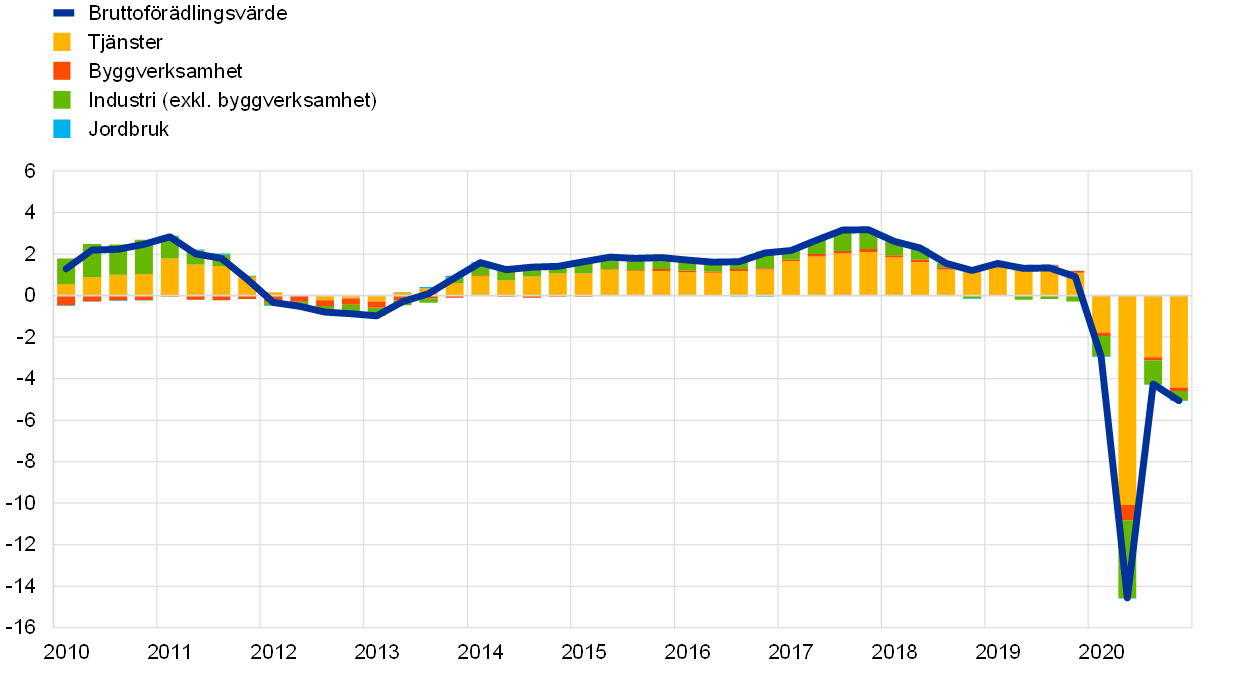 Covid-19:s inverkan på produktionstillväxten varierade också mellan sektorer, där tjänstesektorn bidrog mest till nedgången i det reala bruttoförädlingsvärdet, vilket avspeglar sektorns särskilda exponering för sociala distanseringsåtgärder och sektorssammansättningen i euroområdets ekonomi (se diagram 5).