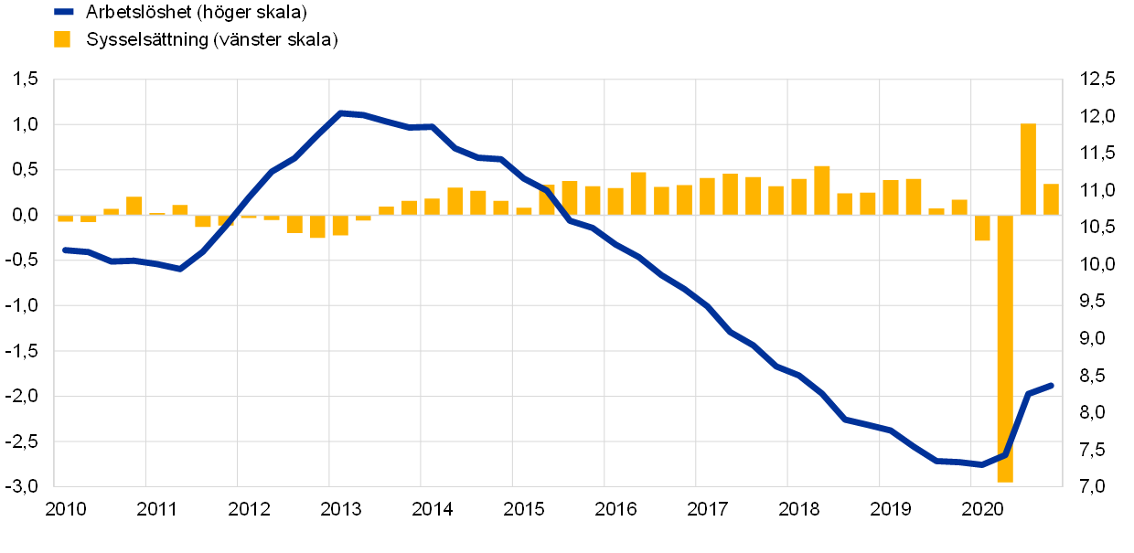 Sysselsättningen minskade med 1,9 procent 2020, medan arbetslösheten steg till 8,4 procent. Ökningen i arbetslöshet var mindre än under tidigare lågkonjunkturer, till exempel under 2008–2009 och 2011–2012, bland annat tack vare de snabba och omfattande insatserna från regeringarna i euroområdet. Samtidigt var arbetsproduktiviteten per timme i genomsnitt cirka 1 procent år 2020 och dämpades av den betydande minskningen av antalet arbetade timmar på grund av användningen av system för att bevara arbetstillfällen.
