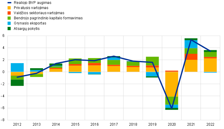 2022 m. euro zonos realusis BVP padidėjo 3,5 % po 5,3 % 2021 m., kai ekonomika atsigavo po nuosmukio, susijusio su pandemija (žr. 1.3 pav.). Augimui didžiausią poveikį 2022 m. darė vidaus paklausa. Metų pabaigoje gamybos apimtis euro zonoje buvo 2,4 % didesnė negu prieš pandemiją, t. y. palyginti su 2019 m. paskutiniu ketvirčiu. Tačiau įvairių šalių augimo rezultatai buvo labai skirtingi, o tai rodė nevienodą ekonomikos struktūrą ir tai, kiek atskiros šalys pasinaudojo paslaugų sektoriaus atsigavimu ir kiek jas paveikė Rusijos invazija į Ukrainą. Pirmąjį pusmetį stipriai atsigavus daug kontaktų reikalingų paslaugų paklausai, sparčiai kylančios energijos kainos mažino išlaidas ir gamybą visoje ekonomikoje. Euro zonoje taip pat buvo juntamas sumažėjusios pasaulinės paklausos ir griežtesnės pinigų politikos poveikis daugelyje pagrindinių ekonomikų, esant dideliam ekonominiam neapibrėžtumui ir mažėjant įmonių bei namų ūkių pasitikėjimui.