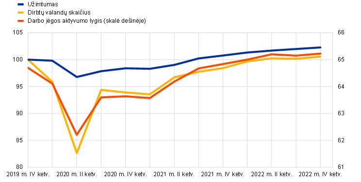 Darbo rinka ir toliau pastebimai atsigavo po pandemijos kartu su didėjančiu euro zonos ekonomikos aktyvumu. Iki 2022 m. ketvirtojo ketvirčio bendras užimtumas ir bendras dirbtų valandų skaičius atitinkamai 2,3 % ir 0,6 % viršijo 2019 m. ketvirtojo ketvirčio lygį (žr. 1.6 pav.). 2022 m. ketvirtąjį ketvirtį darbo jėgos aktyvumo lygis 15–74 metų amžiaus grupėje padidėjo iki 65,2 %, t. y. 0,5 procentinio punkto viršijo 2019 m. ketvirtojo ketvirčio lygį. Didėjant užimtumui, nedarbo lygis toliau mažėjo – nuo ir taip istoriškai žemo 6,9 % lygio (2022 m. sausio mėn.) iki 6,7 % (2022 m. pabaigoje) (žr. 1.7 pav.). Sumažėjo darbo vietų išsaugojimo schemų, dėl kurių per krizę buvo ribojamas atleidimas iš darbo, ir darbuotojai, kuriems taikomos tokios schemos, iš esmės vėl pradėjo dirbti įprastą darbo laiką.
