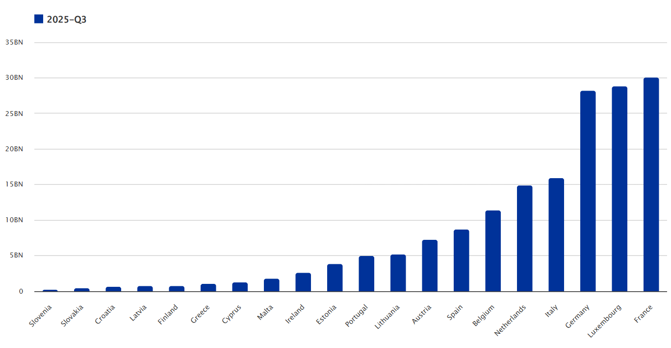 France, Luxembourg, Germany and Italy are the countries in which banks have received the greatest volume of cross-border deposits from other euro area countries. Italy recorded the highest growth in absolute terms over the past five years, with deposits from other countries more than doubling since 2022 (Chart 2). Interestingly, the share of deposits from other euro area countries is highest in Luxembourg (37 percent), Estonia (20 percent), Lithuania (16 percent), Malta (10 percent) and Latvia (6 percent), indicating that smaller countries receive a relatively high level of foreign deposits (Chart 4).