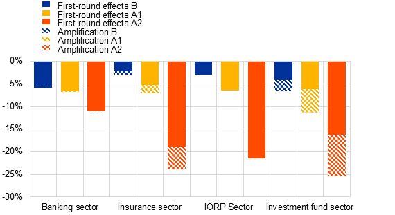 Notes: “Exposures in scope” refers to the assets covered for each sector in this exercise. These are 35% of total credit risk exposures and 26% of total market risk exposures for banks, 81% of total investments for insurers, 76% of total investments for IORPs and 77% of total assets for investment funds. IORPs are not included in the model used to assess cross-sectoral amplification. “B” refers to the baseline scenario, “A1” to the first adverse (run-on-brown) scenario and “A2” to the second adverse (run-on-brown plus recession) scenario.