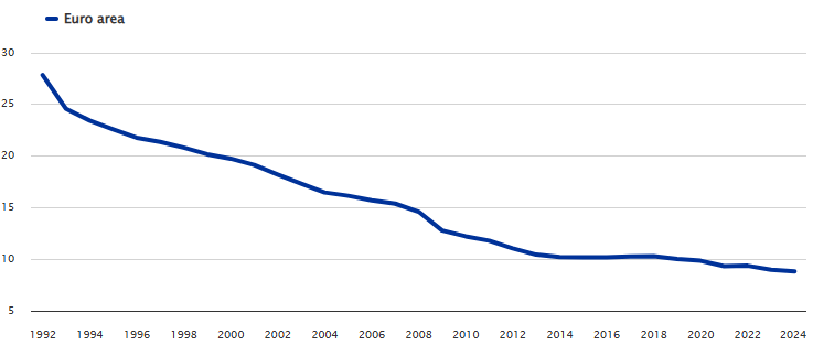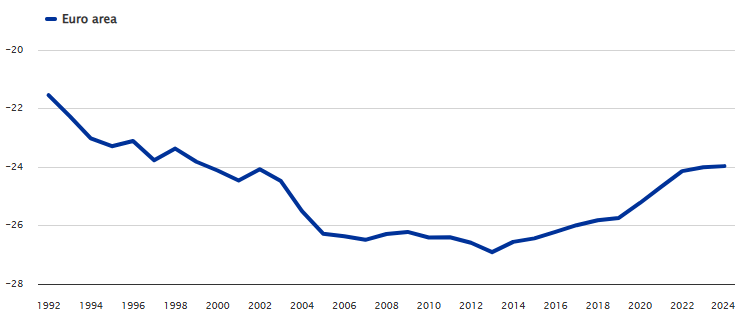 A major factor behind the gender gap is the different labour participation rates of men and women. In 1992 the employment rate of women (44.8%) was 27.8 percentage points lower than that of men (72.7%) across today’s euro area countries (Chart 2).[4] This was because women often struggled to find stable jobs and – to a greater extent than men – took care of their households. Since then female employment has increased gradually, reducing the gap to 9.0 percentage points by 2023. The red bar in Chart 1 shows how the shrinking employment gap – from 17.3 in 2005 to 10.5 percentage points in 2023 – contributed to a similar decrease in the gender earnings gap.