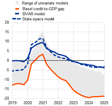 This blog post points to a persistent negative gap – albeit a smaller one than the traditional statistical models might suggest – between the current credit levels and those implied by historical patterns and the prevailing macroeconomic conditions. The future path of this credit-to-GDP gap remains uncertain given the various underlying cyclical and structural factors. The gap may gradually narrow, as the effects of the current monetary easing materialise, uncertainty recedes, and the financial system adapts to shifts in investment, consumption and demographic trends. Nonetheless, close monitoring of its underlying drivers remains essential, given the central role of credit in supporting investment and real economic activity.
