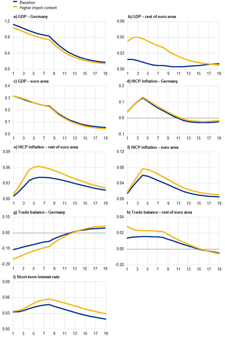 The simulations assume that German government consumption good is produced with a higher share of imports – both from the rest of the euro area and the rest of the world – in proportion to its bilateral trade matrix. In particular, the import content of government consumption is doubled from 2% to 4%. Altering the composition of imports for Germany (e.g. by importing relatively more from the rest of the euro area than from the rest of the world) produces a stronger spillover to the rest of the euro area as a result of a strengthened trade channel. However, given the overall small import content of public spending and the small size of the fiscal impulse, the net difference to the euro area aggregate is negligible.