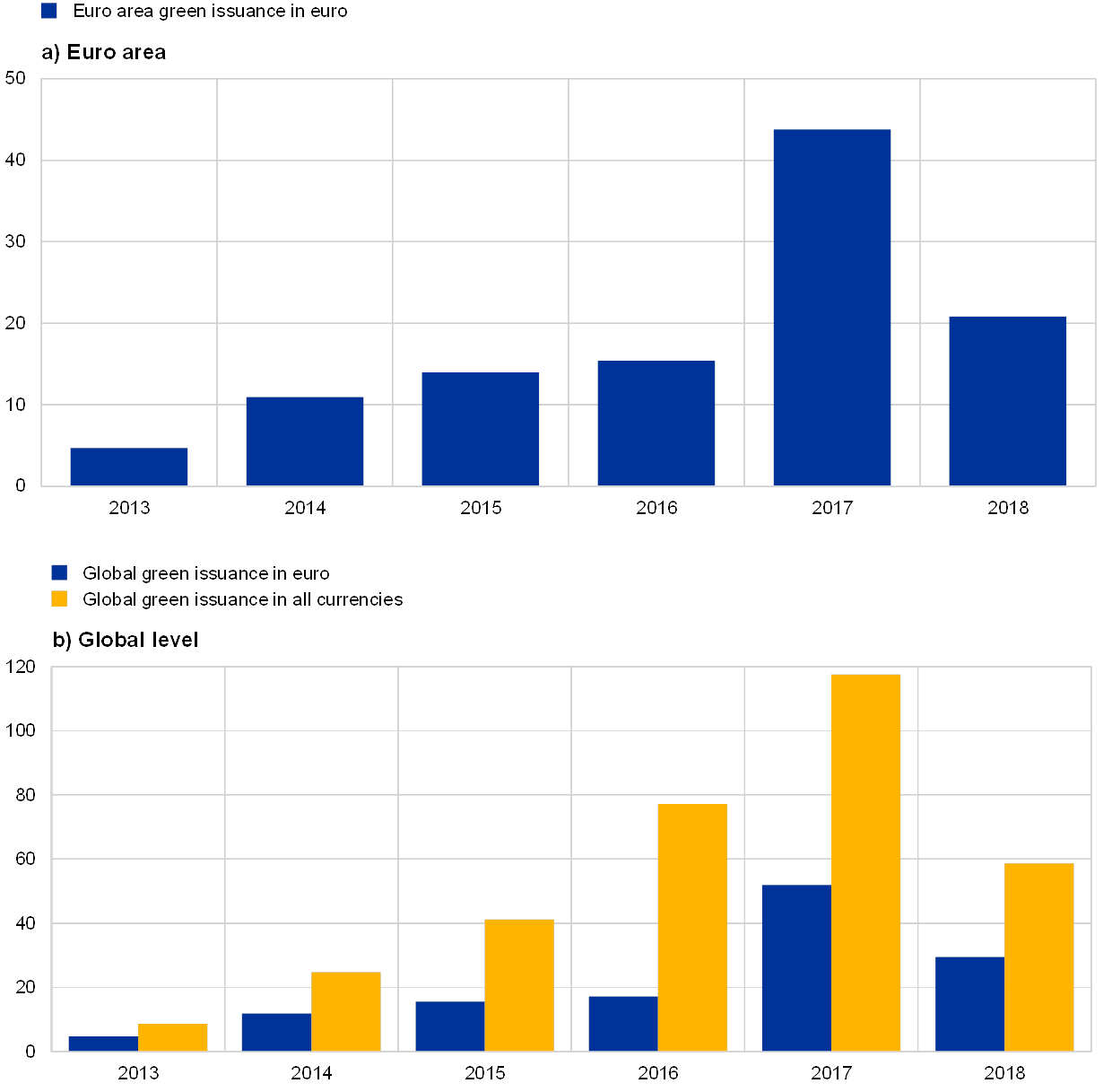 The term “green bond” refers to debt securities whose proceeds are used to finance investment projects with an environmental benefit. There are different approaches to defining and certifying green bonds, and no global market standard has emerged so far.[2] While many green bonds are self-labelled, some jurisdictions have developed their own certification framework and others rely on various different guidelines.[3] As well as reducing transparency for investors, it is believed that the lack of standardised definitions and reporting requirements and the varying granularity of the underlying classifications are holding back supply,[4] inter alia because issuers face reputational risks and potential accusations of “greenwashing” if proceeds are not used for their declared purposes.[5] The ECB supports current EU initiatives under the European Commission’s action plan on sustainable finance to create a harmonised definition of “green” assets (taxonomy), which could improve transparency and facilitate the supply of green debt instruments.