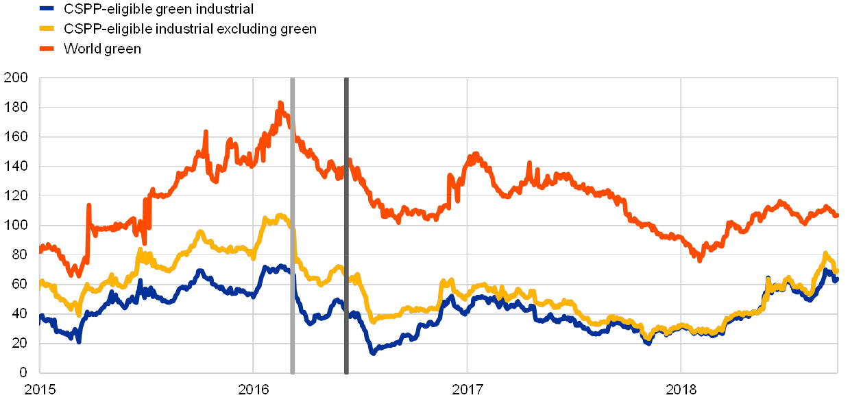 Notes: Z-spread volume-weighted averages based on bonds with (i) issued amounts above €250,000, (ii) rating buckets ranging from A to BBB and (iii) residual maturity ranging from 3 to 11 years for CSPP-eligible bonds or from 1.5 to 20 years for global green bonds. Extreme outliers for global green bond spreads were removed. The vertical lines denote the announcement of the CSPP on 10 March 2016 (light grey line) and the start of purchases under the CSPP on 8 June 2016 (dark grey line). The latest observation is for 27 September 2018.