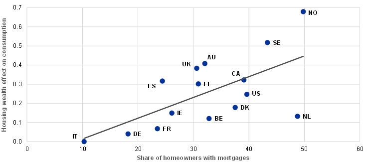 Notes: The peak effect on consumption is normalised by the peak effect on house prices. The latest observations for the housing wealth effects are for the first quarter of 2022. The set of countries depends on data availability. Panel a: the latest observations for share of homeowners with mortgages are for 2020 or earlier. Panel b: the latest observations for the share of ARMs are for 2013.