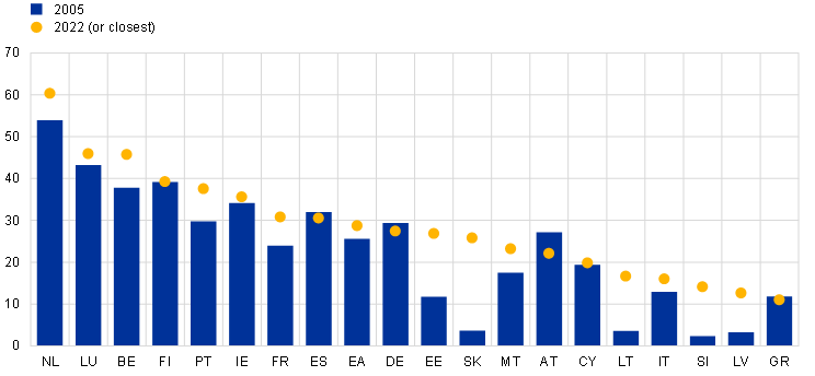 Notes: The set of countries depends on data availability. Panel a: the latest observations are for 2022, or 2021 where 2022 not available. Panel b: the latest observations are for the first quarter of 2022. Data source chosen for consistency with analysis reported in Charts B and C.
