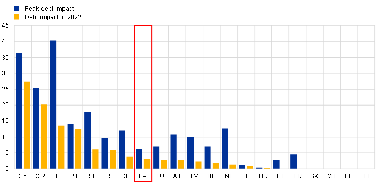 The fiscal impact of financial sector support measures differs considerably across euro area countries. A few countries took no action, or almost none, while the maximum impact on the debt/GDP ratio was close to 10% or more in ten euro area countries, including Germany, the Netherlands, Latvia, Austria, Slovenia, the four euro area countries that required an EU/International Monetary Fund (IMF) adjustment programme (Ireland, Greece, Cyprus and Portugal), and Spain[4], which requested financial assistance from the European Financial Stability Facility/European Stability Mechanism in 2012. The debt impact in the beneficiaries of EU/IMF adjustment programmes was still above 10 percentage points in 2022, in some cases well above (Chart C).[5]