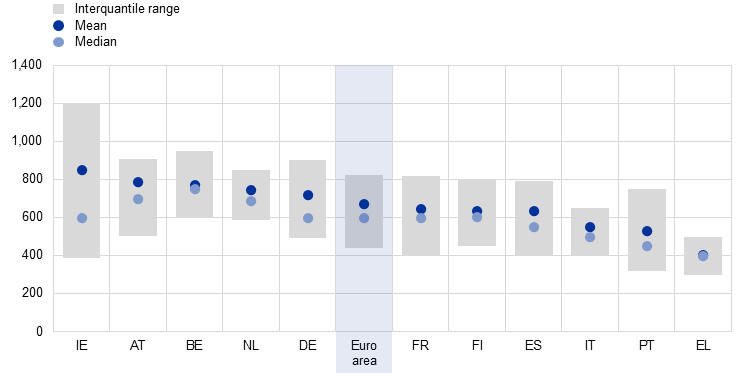 The share of renter households and the level of nominal rents vary considerably across countries. In the euro area, the average share of renters stands at around 28% and nominal rental expenditure amounts to around one-third of households’ monthly income. However, the share of renters varies widely across countries, currently ranging from 15% in Italy to almost 50% in Germany and Austria (Chart A, panel a, left-hand side).[3] The share of renters is highest in the lowest income group (Chart A, panel a, right-hand side). A closer look at the level of nominal rents also reveals a great deal of cross-country and within-country dispersion (Chart A, panel b).[4] Rent dispersion is very high in Ireland, where there are large location-dependent differences (i.e. between urban and rural areas; as also visible in the stark difference between the mean and the median), while it is much lower in Greece and the Netherlands. Overall, the highest nominal rents are observed in Ireland, Austria and Belgium. When looking at rent expenditure relative to household income (Chart A, panel c), the country ranking changes: Ireland still has the highest average rent to income ratio, followed by Greece and Finland, while Germany has the lowest. Countries where renters make up a larger share of the population also tend to have more high-income households as renters, which pushes down the average rent to income ratio.