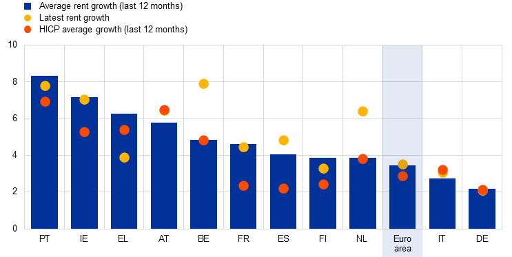 There have been substantial cross-country differences in reported rent growth. The average year-on-year rent growth reported in the CES over the last 12 months has been above 7% in Ireland and Portugal, but below 3% in the Netherlands, Germany and Italy (Chart B, panel b). In the third quarter of 2024 (the most recent values), households in Portugal reported the highest rent growth (this was also much higher than past averages), while the values for Italy and Finland were lower than their past averages. In Ireland and Austria, rent growth has remained consistently high.